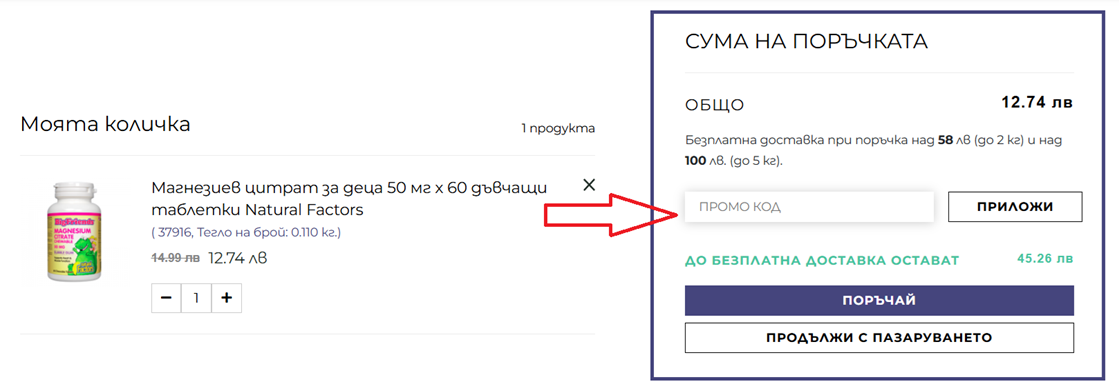 Под сумата за плащане ще видите поле „Промокод“, в което трябва да въведете копирания по-рано код. Кликнете на „Приложи“ и системата автоматично ще отчете отстъпката ви.