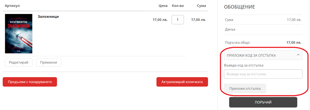 Под сумата за плащане ще видите надпис „Приложи код за отстъпка“. Щракнете на него, за да ви се отволи полето, в което трябва да въведете копирания по-рано код. Кликнете на „Приложи отстъпка“ и системата автоматично ще отчете отстъпката ви.