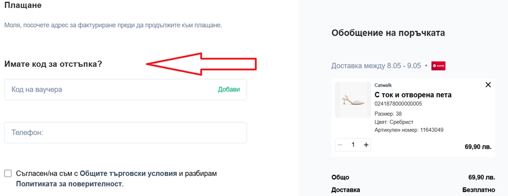 Промокодовете и ваучерите за отстъпка могат да бъдат приложени след стъпката „Сигурно плащане“. Влезте в профила си или пазарувайте като гост. Въведете данните си за доставка. На следващата стъпка ще откриете поле „Имате код за отстъпка?“, в което да въведете вашия промокод. Кликнете на „Добави“, за да получите намалението си и завършете поръчката.
