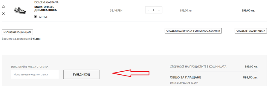 Под избраните от вас неща ще видите поле „Използвайте код за отстъпка“. Поставете копирания код там и кликнете на „Въведи код“, за да може системата да изчисли намалението ви. След това завършете поръчката.