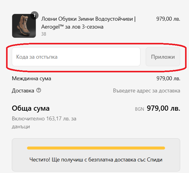 Преминете към плащане и под избраните от вас продукти ще видите полето, в което трябва да въведете копирания по-рано код. Кликнете на „Приложи“ и системата автоматично ще отчете отстъпката ви.