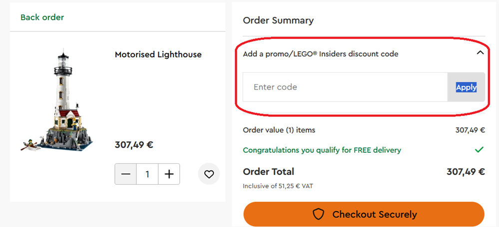 Над сумата за плащане ще видите надпис „Add a promo/LEGO® Insiders discount code“. Щракнете на него, за да ви се отвори полето, в което трябва да въведете копирания по-рано код. Кликнете на „Apply“ и системата автоматично ще отчете отстъпката ви.