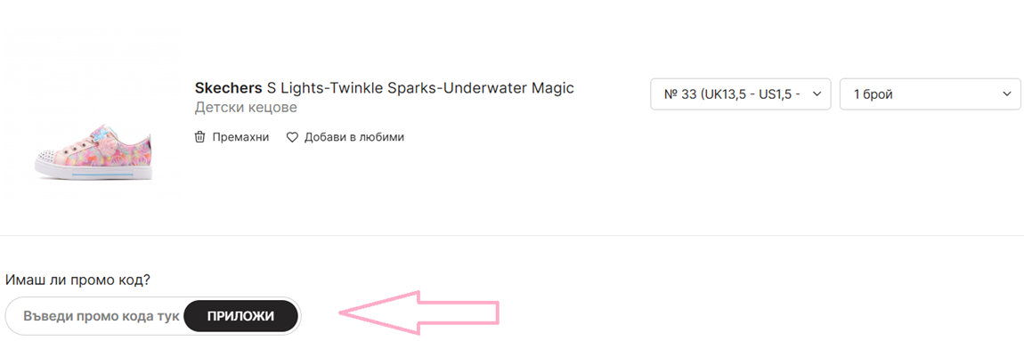 Под избраните от вас продукти ще видите поле „Имаш ли промо код?“, в което трябва да въведете копирания по-рано код. Кликнете на „Приложи“ и системата автоматично ще отчете отстъпката ви.
