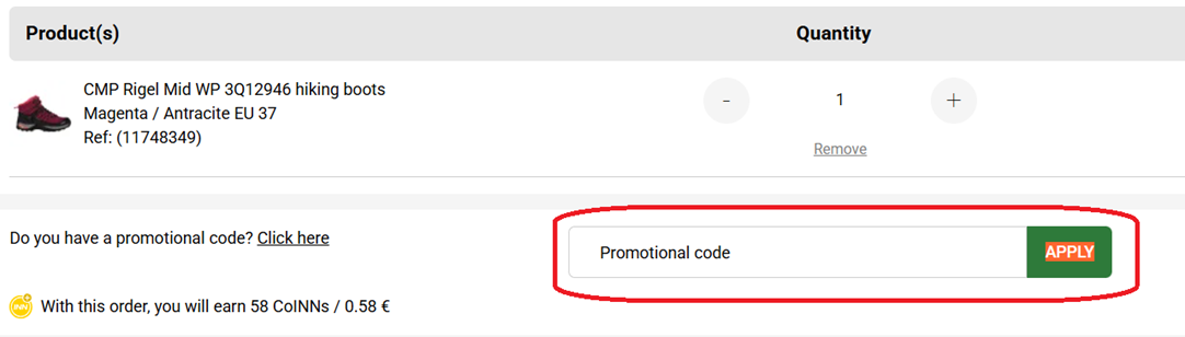 Под избраните от вас продукти ще видите надпис „Do you have a promotional code? Click here“. Щракнете на него, за да ви се отвори полето, в което трябва да въведете копирания по-рано код. Кликнете на „APPLY“ и системата автоматично ще отчете отстъпката ви.