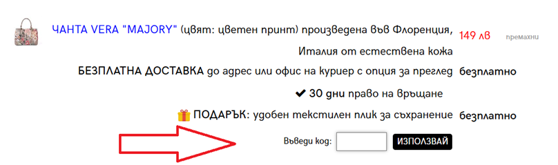 Под избраните от вас продукти ще видите полето, в което трябва да въведете копирания по-рано код. Кликнете на „Използвай“ и системата автоматично ще отчете отстъпката ви.