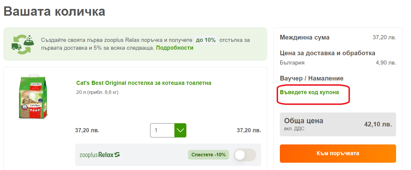 В дясно ще видите „Ваучер/намаление“ и под него текст „Въведете код купона“, на който трябва да щракнете, за да ви се отвори поле, където да въведете вашия Zooplus код за отстъпка.