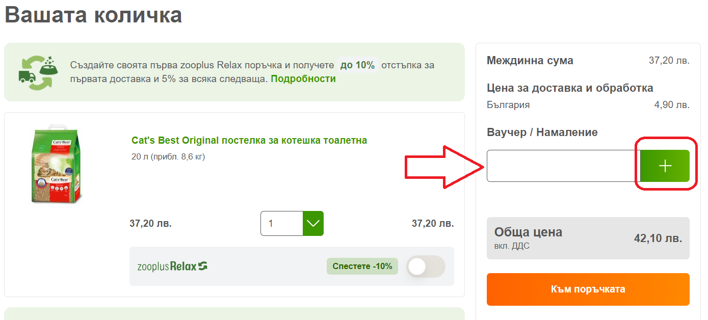 След като поставите Zooplus код за отстъпка, натиснете плюса и системата автоматично ще отчете отстъпката ви. Кликнете на „Към поръчката“, за да продължите към избора на доставка и плащане.